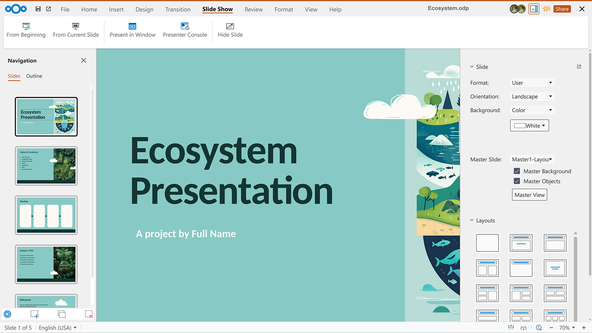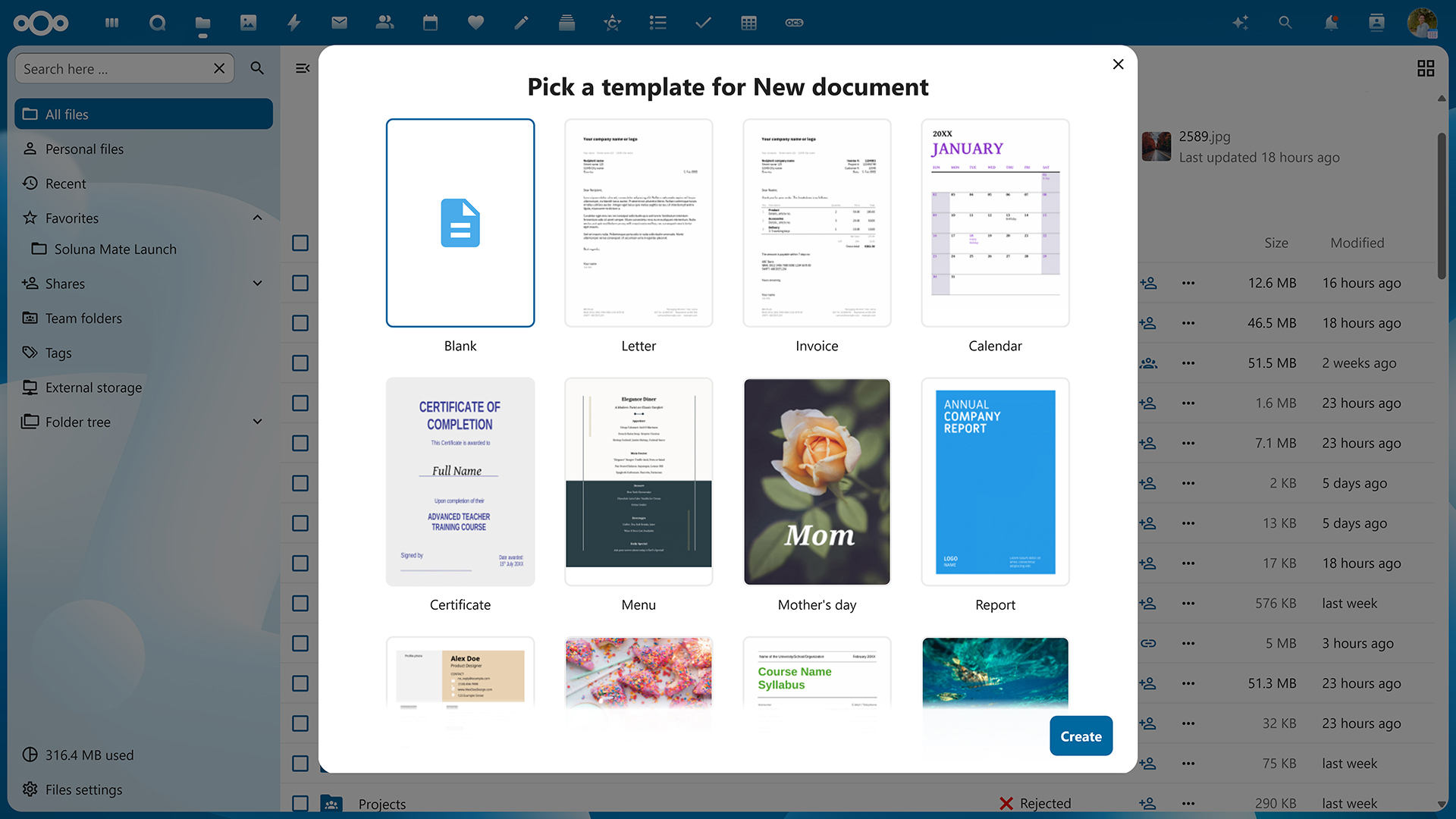 We added 11 new file templates across documents, spreadsheets, and presentations, and reworked six older templates to cover the most common tasks with convenient, great looking templates. Users can add more themselves in their templates folder.