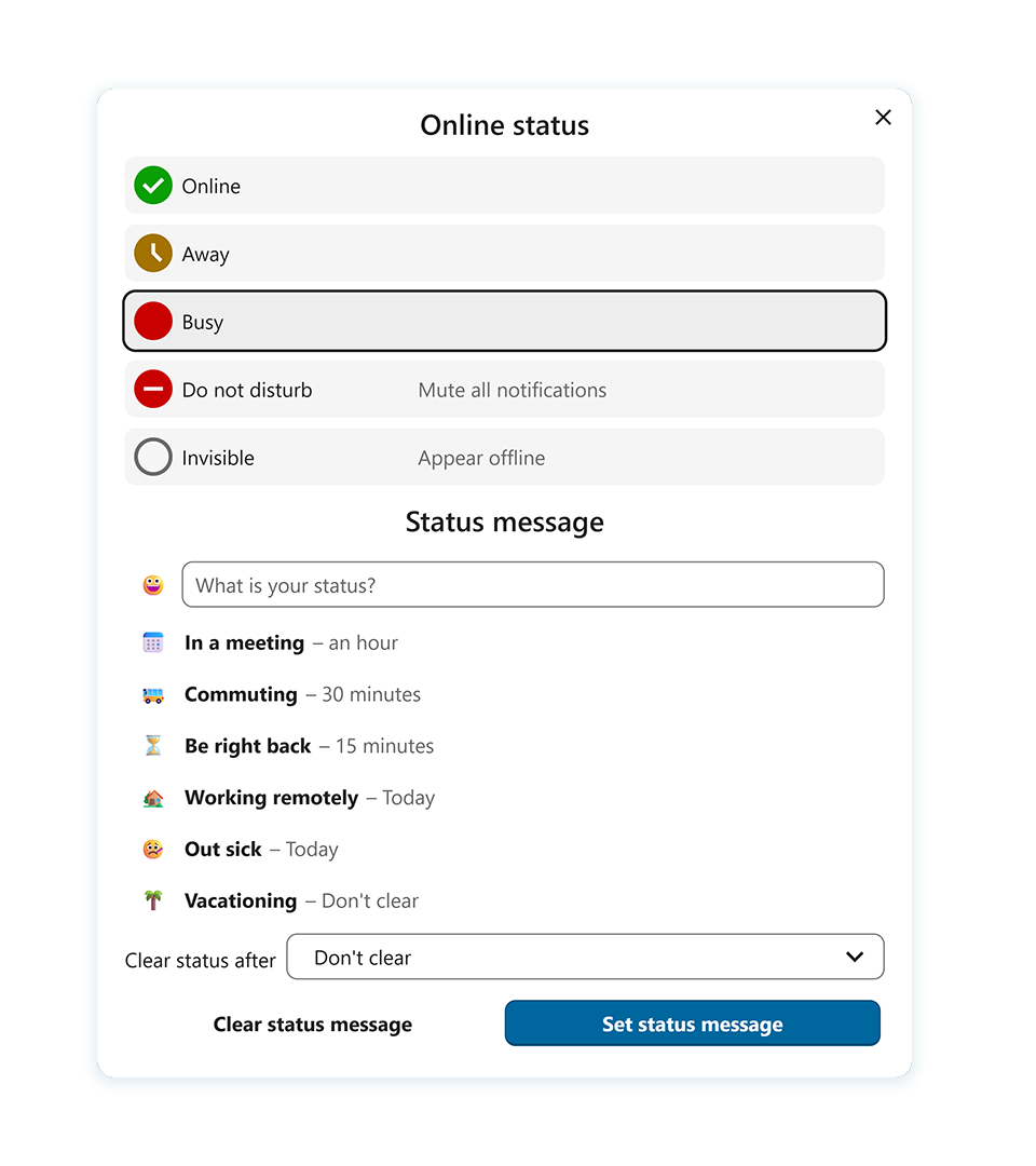 Talking about busy, there’s now the new “🔴 Busy” status to communicate your availability, in addition to other statuses that also got new easily recognizable icons. “🔴 Busy” activates automatically during calls and scheduled meetings.